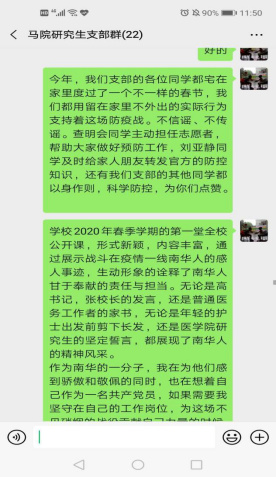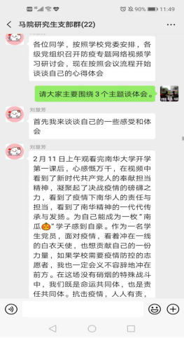 研究生刘慧芳、魏美霞、罗丹等同学表示,通过收看PA电子2020年春季学期第一堂全校公开课,看到了南华人在防疫抗疫战斗中的感人事迹,看到了疫情下南华人的责任与担当,表示要从自身做起,科学防控,相信党和政府,不信谣、不传谣,引导群众坚定战胜疫情的信心。