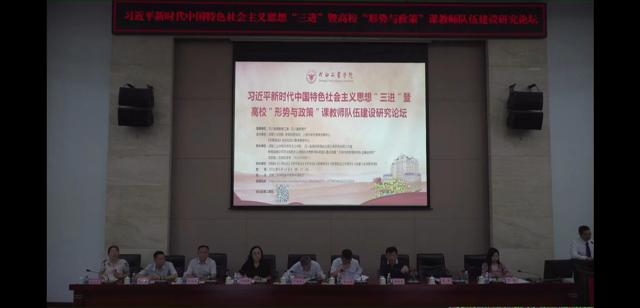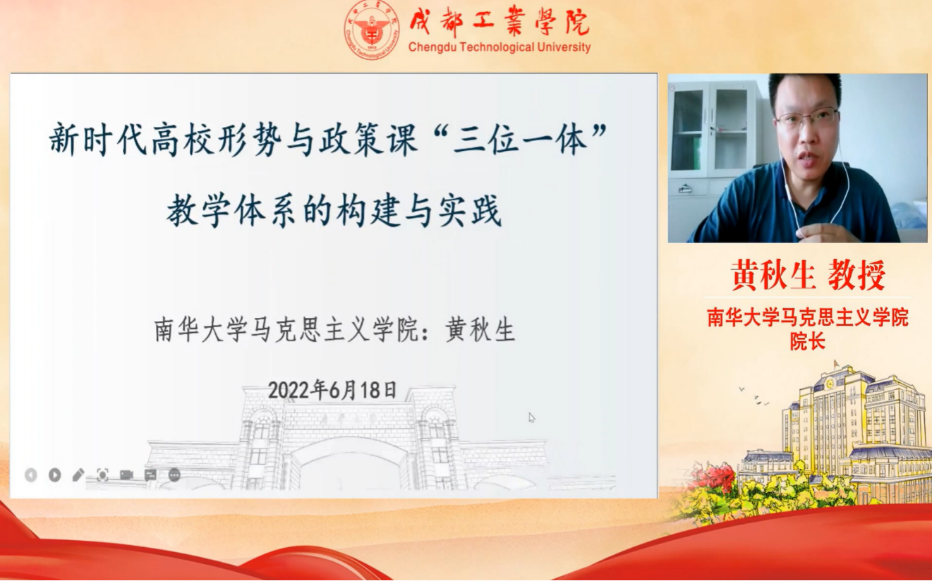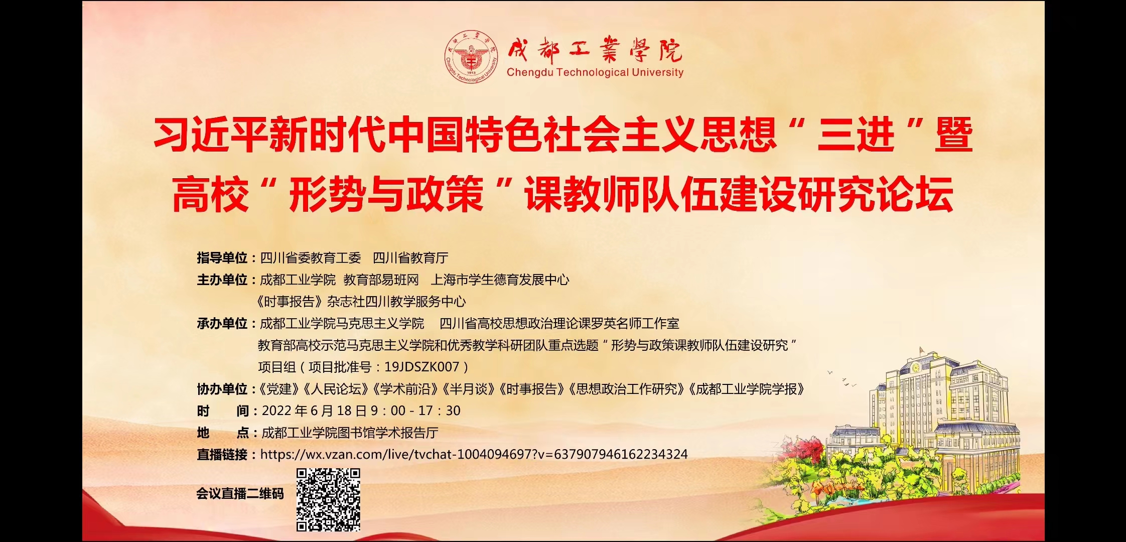 618日,由成都工业学院教育部易班网、上海市学生德育发展中心、中宣部《时事报告》杂志社主办,成都工业学院PA电子、四川省高校思想政治理论课罗英名师工作室、教育部高校示范PA电子和优秀教学科研团队重点选题“‘形势与政策’课教师队伍建设研究”项目组(项目批准号:19JDSZK007)承办的习近平新时代中国特色社会主义思想“三进”暨高校“形势与政策”课教师队伍建设研究论坛成都工业学院图书馆学术报告厅举行,会议采取线上线下相结合的形式进行,学院院长黄秋生教授受邀参加本次论坛并作主题发言。