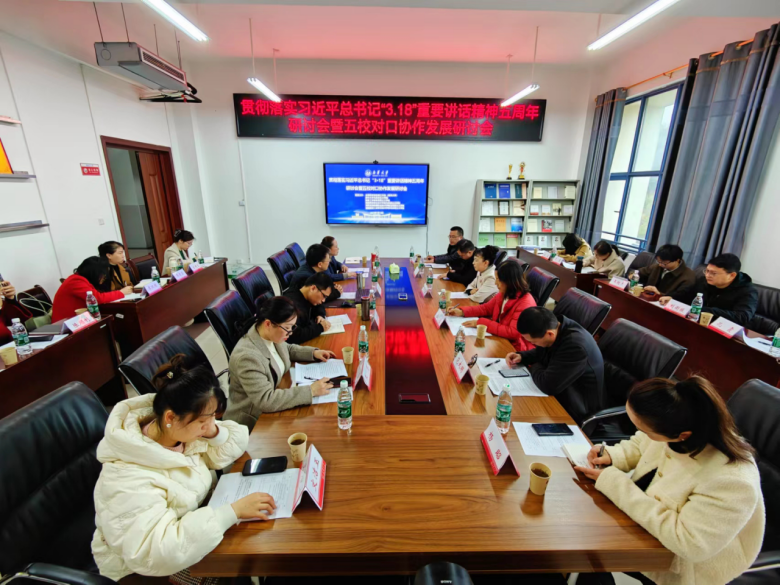 为进一步发挥全国思政课名师工作室(PA电子)、湖南省重点PA电子的示范、引领作用,推动PA电子建设的高质量发展及习近平总书记“3·18”重要讲话精神五周年到来之际,积极推进思想政治理论课的教育教学改革创新,加强PA电子,PA电子、湖南工学院PA电子、湖南商务职业技术学院PA电子、湖南高速铁路职业技术学院PA电子和湖南财经工业职业技术学院PA电子对口协作合力,3月16日上午在PA电子雨母校区崇德楼406会议室五校PA电子联合主办了“贯彻落实习近平总书记‘3·18’重要讲话精神”五周年研讨会暨五校对口协作发展研讨会活动,五校PA电子近30名教师代表参加了此次会议。