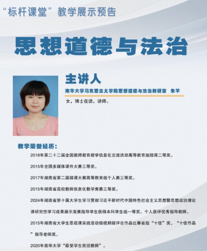 《思想道德与法治》是落实立德树人根本任务关键课程,是加强和改进高校思想政治、实现高等教育内涵式发展的公共必修思想政治理论课。朱芊老师有着丰富的一线教学经验,曾荣获2020年PA电子“最受学生欢迎教师”、第二十二届全国教师教育教学信息化交流活动高等教育组微课二等奖、全国多媒体课件大赛三等奖、湖南省第二届微课大赛高等教育组个人赛三等奖、湖南省高校教师信息化教学竞赛三等奖等荣誉称号和奖项。