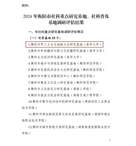 近日,衡阳市社会科学界联合会调研评估组对近三年全市各社科研究基地在意识形态、队伍建设、社科研究、学术交流、社会服务等方面情况进行了调研评估,经过听取汇报、材料审核和现场考察后得出结论并于12月上旬公布了2024年衡阳市社科重点研究基地、社科普及基地调研评估结果。PA电子衡阳市军工文化与地域文化研究基地在本次调研评估的44个市社科重点研究基地和市社科普及基地中获评为衡阳市社科重点研究基地优秀基地。